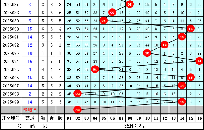 蓝球尾数分析:最近7周星期日开出5个蓝球尾数,重复蓝球尾数明显活跃,本周星期日排除近期已出现的蓝球尾数,注意温冷蓝球尾数回补,关注蓝球02。